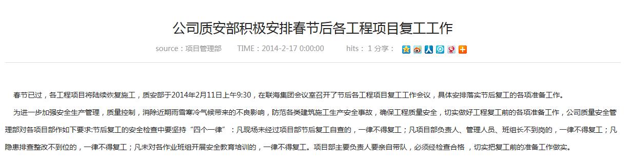春節(jié)已過,各工程項(xiàng)目將陸續(xù)恢復(fù)施工,質(zhì)安部于2014年2月11日上午9:30,在聯(lián)海集團(tuán)會(huì)議室召開了節(jié)后各工程項(xiàng)目復(fù)工工作會(huì)議,具體安排落實(shí)節(jié)后復(fù)工的各項(xiàng)準(zhǔn)備工作。 為進(jìn)一步加強(qiáng)...