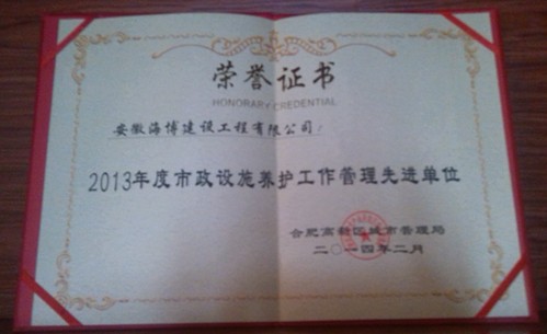 2014年4月,公司承攬的合肥市高新區(qū)市政養(yǎng)護(hù)工程,因表現(xiàn)優(yōu)異,被合肥市高新區(qū)城市管理局授予“2013年度市政設(shè)施養(yǎng)護(hù)工作管理先進(jìn)單位”榮譽(yù)證書。 公司自2009年承攬合肥市高新區(qū)市...