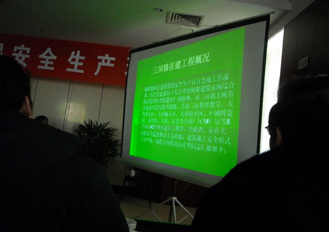 黨組書記張永安同志首先就肥西縣建設(shè)局發(fā)布的 “建設(shè)[2009]151號(hào),建設(shè)[2009]154號(hào),建設(shè)[2009]155號(hào)”文件中的工作進(jìn)行安排。接著解軍培同志講述了“百日會(huì)戰(zhàn)”開展情況,并就安全檢查中存在的隱患以幻燈片的形式展示給參會(huì)企業(yè),讓企業(yè)領(lǐng)導(dǎo)體會(huì)在建項(xiàng)目安全隱患的嚴(yán)重性以及安全隱患處理的緊迫性。李紹敏同志就施工報(bào)建、安全生產(chǎn)、農(nóng)民工工資等問題提出存在的問題及整改要求,重點(diǎn)對施工用電、臨邊防護(hù)、腳手架搭設(shè)及地面硬化、施工機(jī)具現(xiàn)場防護(hù)及現(xiàn)場施工人員的安全意識(shí)等方面存在的問題進(jìn)行批評和教育,要求企業(yè)領(lǐng)導(dǎo)一定要在安全生產(chǎn)過程中起帶頭作用,深入項(xiàng)目施工現(xiàn)場,親自把關(guān),把整改措施落實(shí)到位。