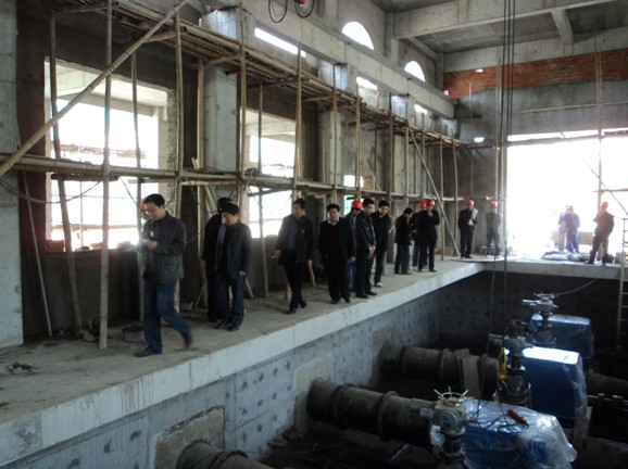 檢查組一行認(rèn)真查看了施工現(xiàn)場,對泵站主體、進(jìn)水池、出水池、機電設(shè)備安裝等進(jìn)行了細(xì)致檢查,并向施工人員詳細(xì)詢問了泵站建設(shè)階段的相關(guān)技術(shù)問題。隨后又對我公司施工資料進(jìn)行了檢查。