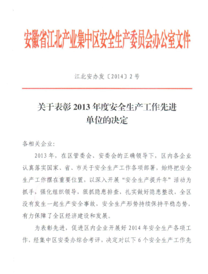 4月2日,安徽省江北產(chǎn)業(yè)集中區(qū)召開(kāi)2014年第一次安全生產(chǎn)會(huì)議,我公司市政道路四期項(xiàng)目部在安全生產(chǎn)工作中表現(xiàn)突出,被集中區(qū)管委會(huì)、安委會(huì)授予“2013年度安全生產(chǎn)工作先進(jìn)單位”榮譽(yù)稱(chēng)號(hào)。