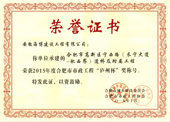 炎炎夏日,驕陽似火,我公司喜獲2015年度合肥市市政工程“廬州杯”獎,給酷熱的盛夏送來了陣陣涼意。由公司承建的合肥市高新區(qū)寧西路(長寧大道-肥西界)道橋及附屬工程經(jīng)合肥市城鄉(xiāng)建設(shè)委員會及合肥市市政工程協(xié)會審定,順利獲得此次獎項。