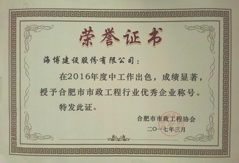 會議對榮獲2016年度合肥市市政工程優(yōu)秀企業(yè)、優(yōu)秀項目經(jīng)理進(jìn)行了表彰,78家會員單位獲得“市政工程優(yōu)秀企業(yè)”證書,174名項目經(jīng)理獲得“市政工程優(yōu)秀項目經(jīng)理”證書。我公司獲得“市政工程優(yōu)秀企業(yè)”榮譽,望江西路(將軍嶺路-新橋大道)建設(shè)工程二標(biāo)獲得“市政工程安全質(zhì)量標(biāo)準(zhǔn)化示范工地”榮譽,呂偉、孫斌、王鎮(zhèn)華等三人獲得“優(yōu)秀項目經(jīng)理”榮譽。