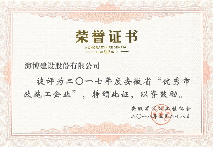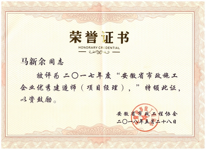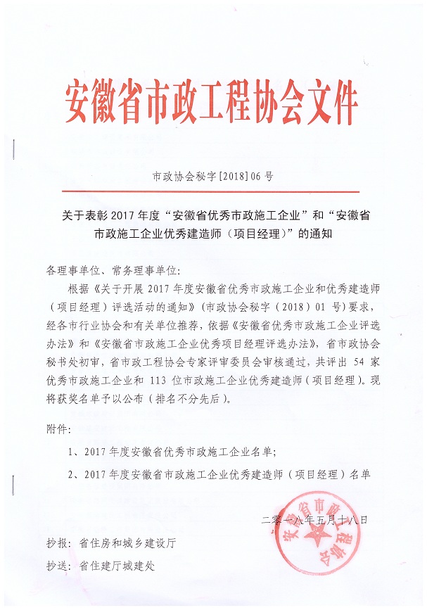 近日,安徽省市政工程協(xié)會發(fā)布了市政協(xié)會秘字【2018】06號文件,文件中表彰了2017年度“安徽省優(yōu)秀市政施工企業(yè)”和“安徽省市政施工企業(yè)優(yōu)秀建造師(項目經(jīng)理)”。經(jīng)過省市政工程協(xié)會專家評審委員會的層層評比,我司榮獲2017年度“安徽省優(yōu)秀市政施工企業(yè)”稱號,公司馬新余、周宗兵、趙行東三位同志被授予“安徽省市政施工企業(yè)優(yōu)秀建造師(項目經(jīng)理)”稱號。