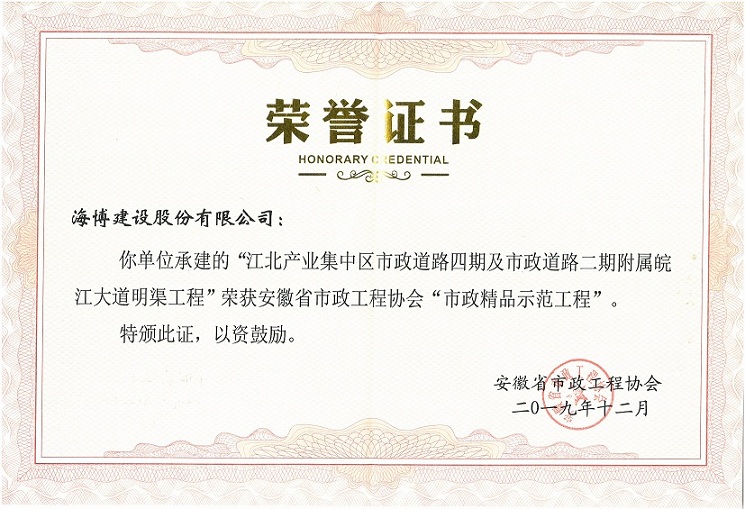 安徽省市政精品示范工程是我省市政行業(yè)給予企業(yè)管理的極高榮譽,對于市政行業(yè)管理有重要的標(biāo)桿引領(lǐng)意義,該項榮譽的獲得,是對我司長期堅持“精細(xì)化管理,創(chuàng)精品工程”項目管理工作的充分肯定,也是我司一直秉承“永遠致力于提供更好對產(chǎn)品和服務(wù),持續(xù)為客戶創(chuàng)造更大價值”經(jīng)營理念的充分體現(xiàn),樹立了企業(yè)的良好形象。