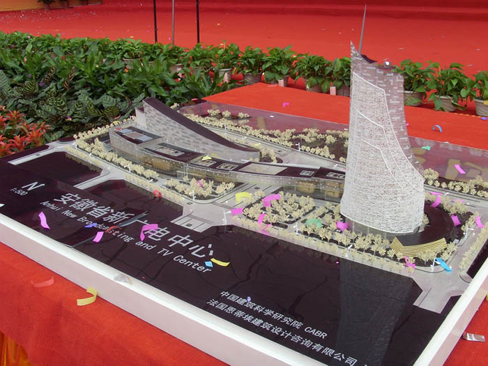 安徽省廣播電視新中心項目位于筆架山街道轄區(qū)內(nèi)的祁門路與懷寧路西南角,西鄰藍蝶苑,北臨天鵝湖。主要由兩棟樓構成,東邊是49層的主樓,西邊是演播大廳和一個露天演藝廣場及一個高13層群樓, 東西兩幢樓之間由一座景觀橋連接,兩樓造型均為S型.項目包括省電臺、省電視臺、省傳輸總臺、省廣電傳媒產(chǎn)業(yè)集團和省網(wǎng)絡公司等單位的節(jié)目制作、播出、傳輸以及監(jiān)控機房等。新中心占地273畝,將分兩期建設,一期建設26萬平方米,投資17億元;主樓高226.5米,建成后將成為合肥市最高建筑;廣電新中心3600平方米的演播廳,為國內(nèi)最大的電視演播廳,將于明年10月1號投入使用。