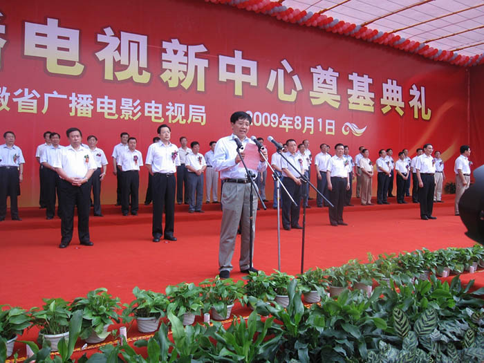 儀式上省廣電局張?zhí)K洲局長和孫金龍書記先后在典禮上致辭,王金山同志宣布奠基開工儀式正式啟動,省市主要領導同志為奠基碑培土奠基,兩邊的禮花在掌聲中同時綻放,施工機械也同時鳴笛,為省廣播電視新中心項目正式開工拉開了序幕。